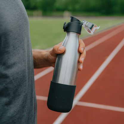 Mit dem FLSK sports kit rüstest Du Deine FLSK Trinkflasche im Handumdrehen zum ultimativen Sport-Accessoire auf. Der sports lid lässt sich einfach anstelle des normalen Deckels aufschrauben. Dank des Einhand-Mechanismus kannst Du mit einem simplen Fingerdruck auf den Knopf trinken, ohne Deine Aktivität unterbrechen zu müssen – ideal beim Joggen, Radfahren oder im Fitnessstudio. Anschließend lässt sich der Deckel genauso leicht wieder verschließen. Praktisch: Nach dem Training darf der Deckel ganz unkompliziert in die Spülmaschine. Das FLSK sports sleeve aus strapazierfähigem Silikon bietet Deiner Flasche zusätzlichen Halt und schützt sie optimal vor Stößen und Kratzern. Damit steht deine Flasche stabil und ist bestens geschützt.